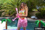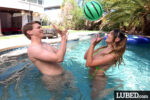 Aubry Babcock teases in green string bikini and pink skirt by the pool with Sage Roux, quickly exposing her natural tits, pink pussy, and bu…