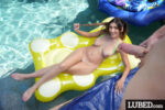 Aubry Babcock teases in green string bikini and pink skirt by the pool with Sage Roux, quickly exposing her natural tits, pink pussy, and bushy pubic hair on inflatables. Sage gropes her spread ass and labia, lubes her shiny body head-to-toe, drenching vulva and boobs. Aubry vibes her wet slit, rides his thick cock cowgirl with legs wide, takes doggy pounding ass-up on floats, missionary thrusting deep. Sage eats her oily pussy, she deepthroats his big dick in pigtails. Ends with creampie cum dripping from her stretched hole, facial blast covering her smiling face, tan lines glistening.